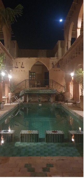 8.Tag: Meditation und kreatives Schreiben zur Stressbewältigung und persönlichen Entwicklung; Nach dem Frühstück Rückreise nach Marrakesch; Zwischenstopp in Ouarzazates. Nach Ankunft in Marrakesch Führung durch die Medina, die Souks und über den Marktplatz Djemaa el Fna, (Weltkulturerbe der UNESCO), gemeinsames Abendessen in der Nähe des Platzes und Übernachtung im Hotel Les Trois Palmiers, 18 Rue Loubnane, 40000 Marrakesh.