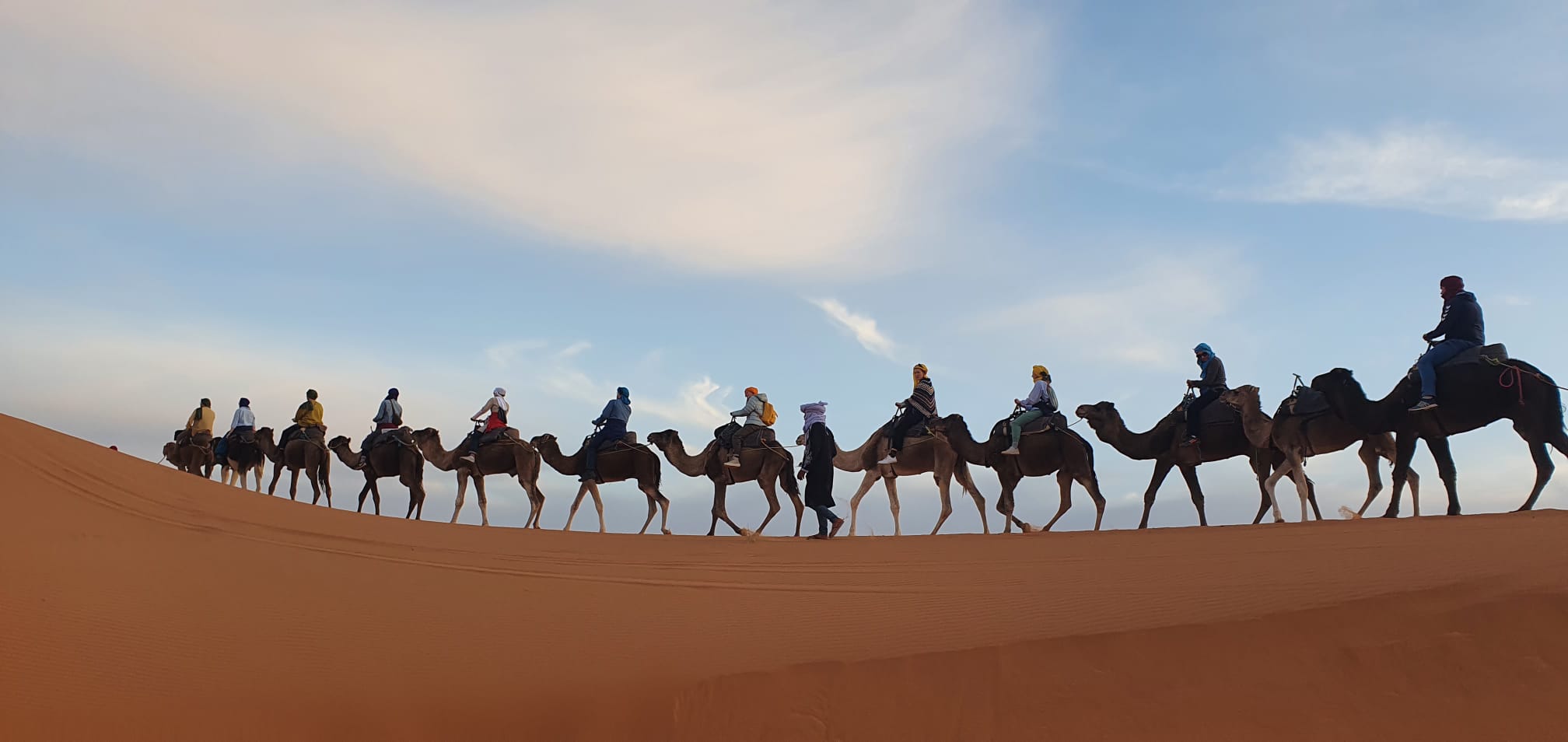 In der Wüste von Merzouga werden wir am Fuße einer Sanddüne in einer typischen Kasbah übernachten. Mit den Dromedaren reiten wir durch die Wüste in ein Zeltlager. Dort werden wir den Abend ausklingen lassen mit Musik und Gesang einheimischer Berber.