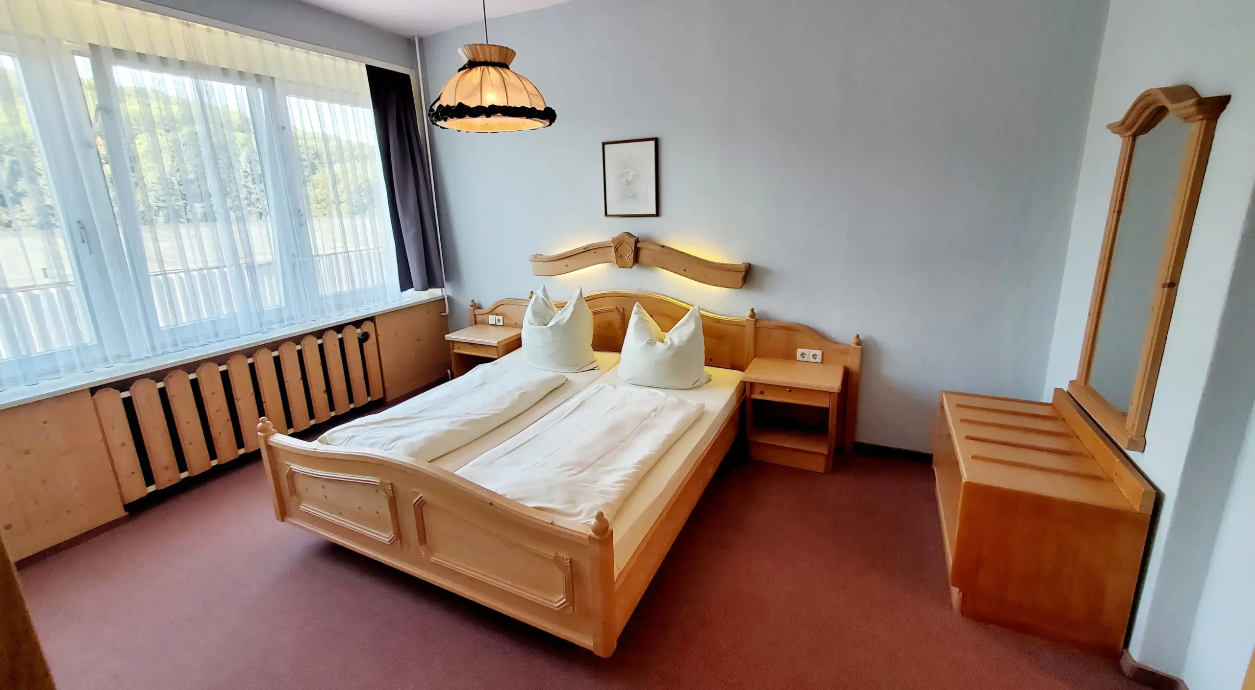 Alle Gästezimmer verfügen über: Schreibtisch, Flachbild-TV, eigenes Badezimmer, Kleiderschrank, Bettwäsche und Handtücher.