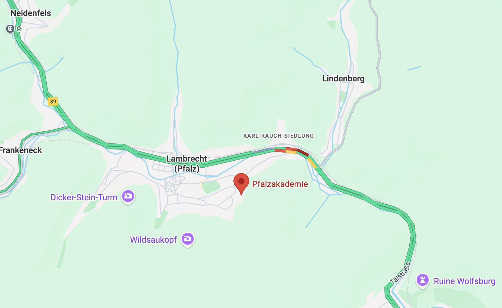 Die S-Bahn-Haltestelle Lambrecht liegt ca. 15/20 Gehminuten entfernt. Dank der Linien S1 und S2 ist die Pfalzakademie außerdem optimal mit den Großstädten Mannheim, Ludwigshafen, Kaiserslautern, Homburg und Bad Dürkheim vernetzt.